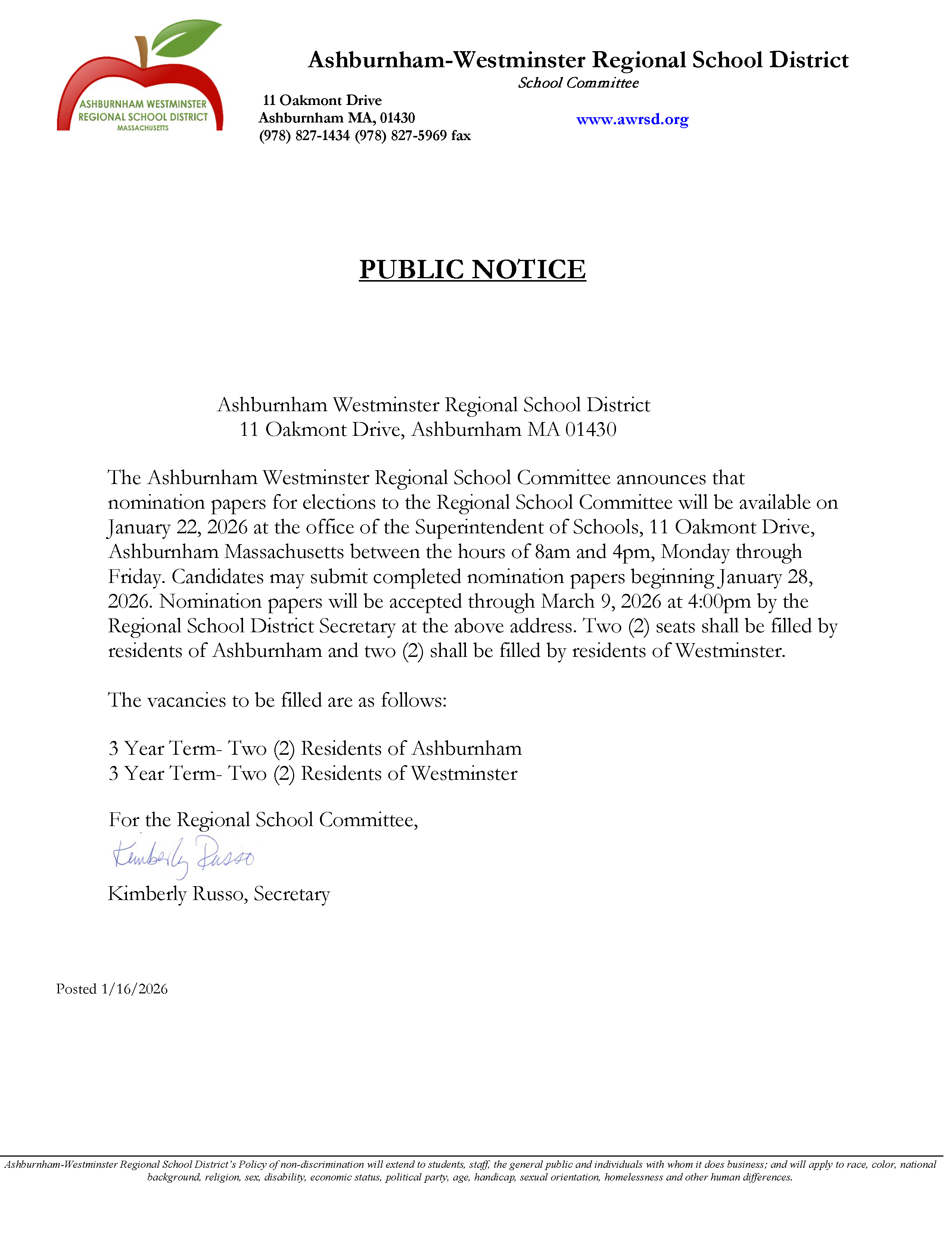 The Policy Subcommittee of the AWRSD School Committee will meet 1/15/2026 at 6:30pm in Nims Library in Oakmont Regional High School.